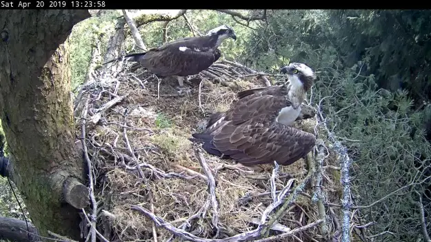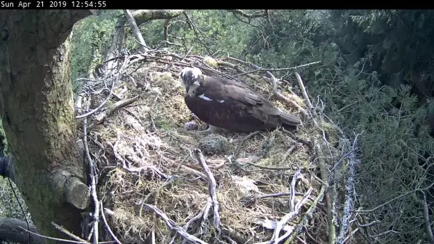 Come Easter Sunday, the obliging Mrs O decided to make it memorable this year, and laid her first egg of 2019. Needless to say, this was a very happy day in the osprey watch hut for volunteers and visitors. Mrs O and SS sat in the nest with their prize egg just as crowds of children were running around Kailzie Gardens, indulging in their own egg hunts.