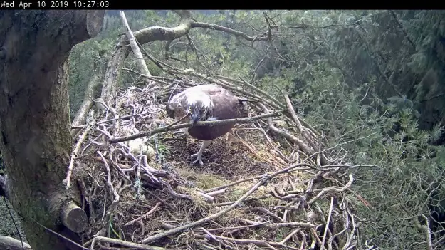 SS brought a fish in after a hunting trip on Wednesday and gave it to Mrs O. She went up onto the perch and ate it, and SS looked very tired after his exertion. He sat in the nest relaxing and resting with his eyes closed. We have not witnessed him sleeping at the nest before, but he is a 20 year old bird now and has just arrived back from his long migration. He will need to build up some strength for the summer, to provide for a family of hungry young, and a partner, as well as feeding himself.